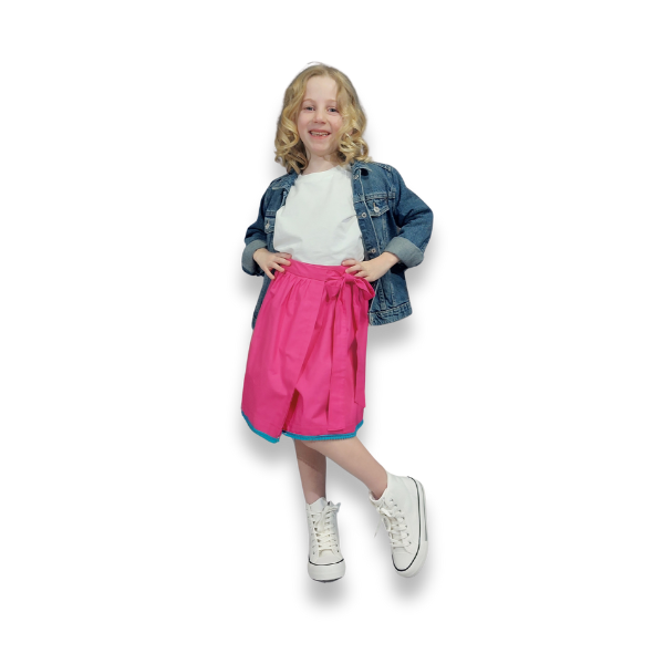 Die liebevoll gestalteten Einschulungskleider und Wickelröcke in fünf Farben (Lila, Rosa, Pink, Mint und Türkis) werden mit witzigen Borten und Schleifen zu deinem perfekt Look!